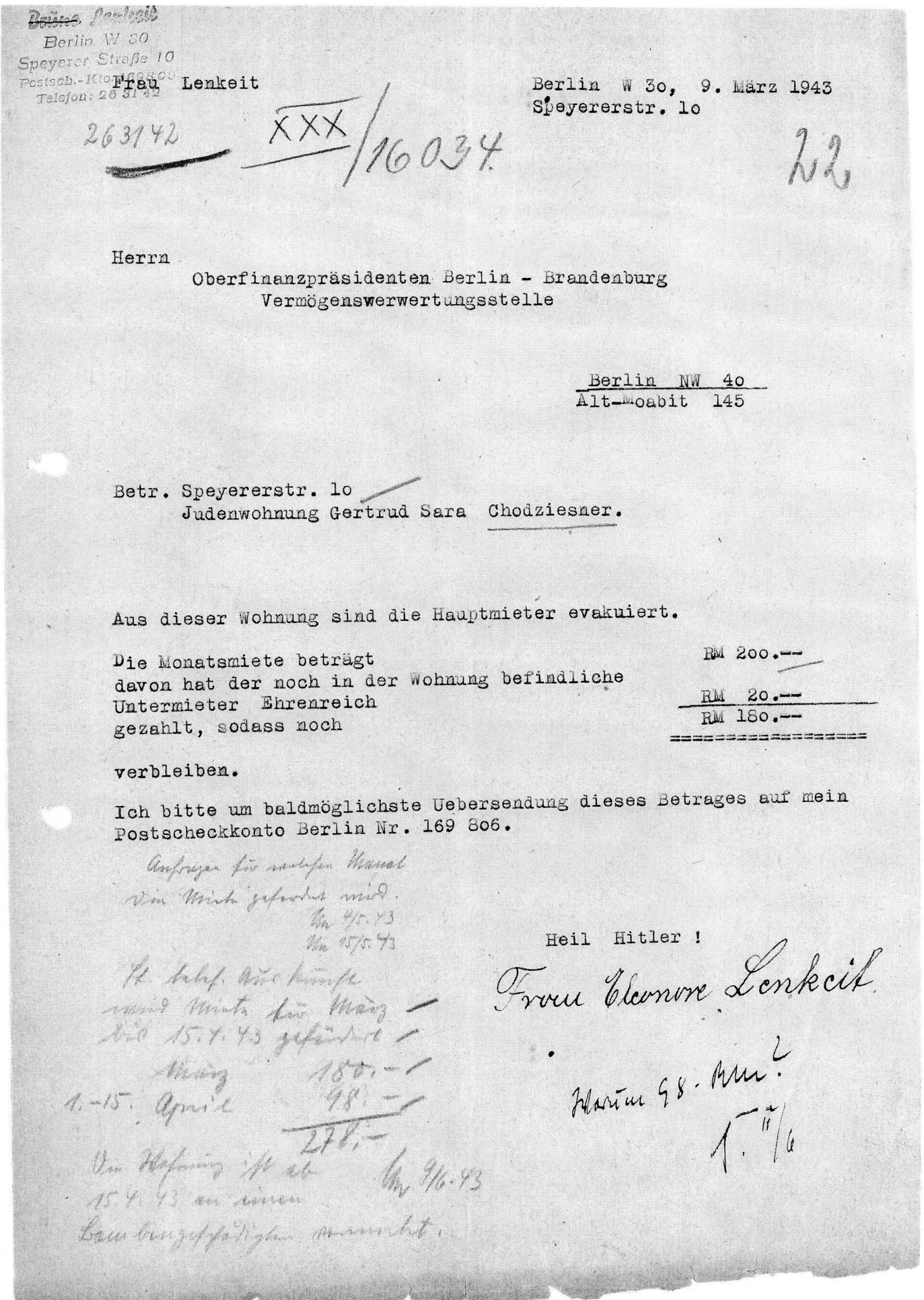 Der Vater Ludwig Chodziesner wird anlässlich der „Reichskristallnacht“ im November 1938 für einige Tage im Gefängnis der Gemeinde Falkensee inhaftiert. Er muss danach das Haus und Grundstück in Finkenkrug verkaufen. Er zieht im Januar 1939 mit seiner Tochter Gertrud in eine Mietswohnung in der Speyrer Straße in Berlin Schöneberg. 1942 wird er nach Theresienstadt deportiert, wo er als einundachtzigjähriger im Februar 1943 stirbt.