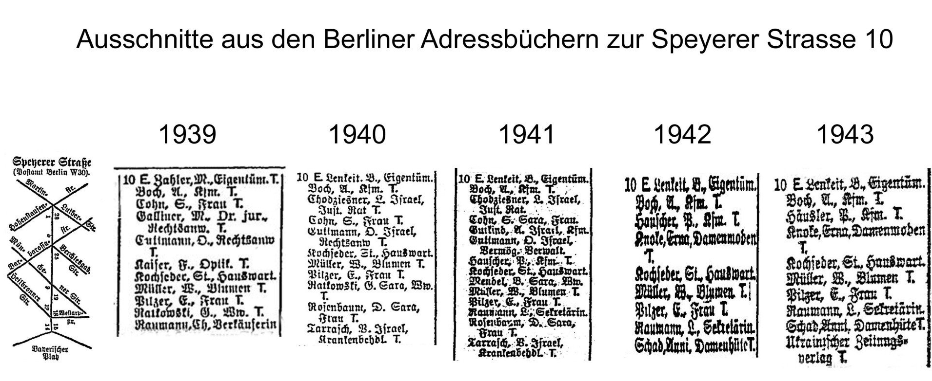Die letzten Berliner Adressbücher erscheinen für das Jahr 1943. Für das Jahr 1942 werden die immer noch im Haus wohnenden jüdischen Bewohner nicht mehr aufgelistet. Kontinuität für die „arischen“ Bewohner wird deutlich. Einer von ihnen mit dem Barsoi, der Kolmar an ihren Hund Flora erinnert. Das Haus Speyererstraße 10 wird im zweiten Weltkrieg durch Bomben zerstört.
